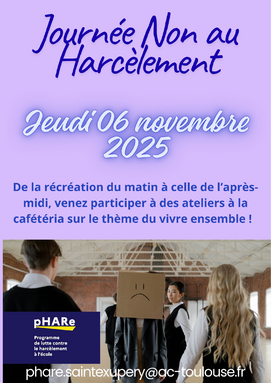 Dans le cadre de la journée nationale de lutte contre le harcèlement scolaire, le jeudi 06 novembre, venez participer à des ateliers sur le thème du vivre-ensemble,