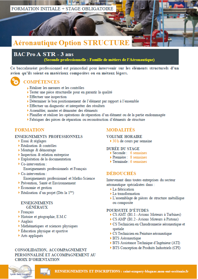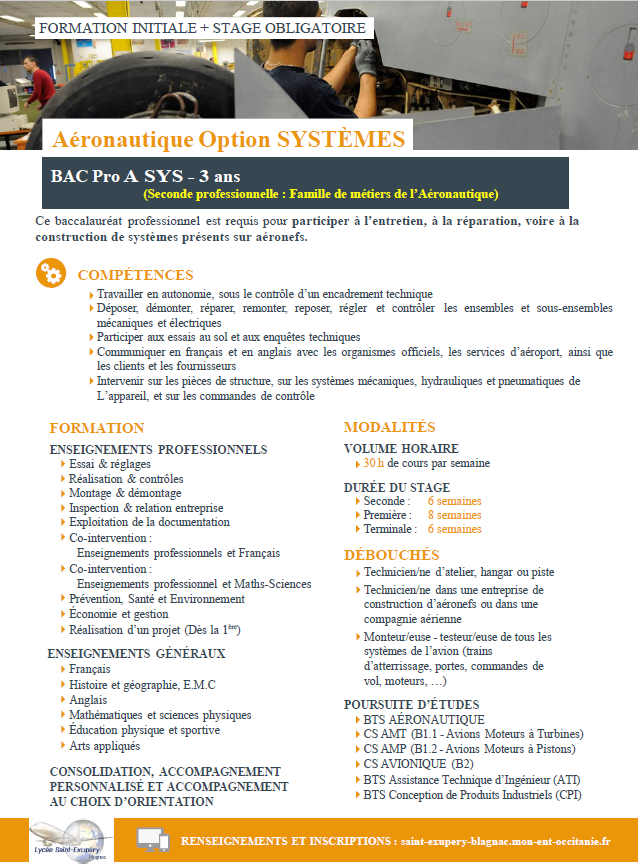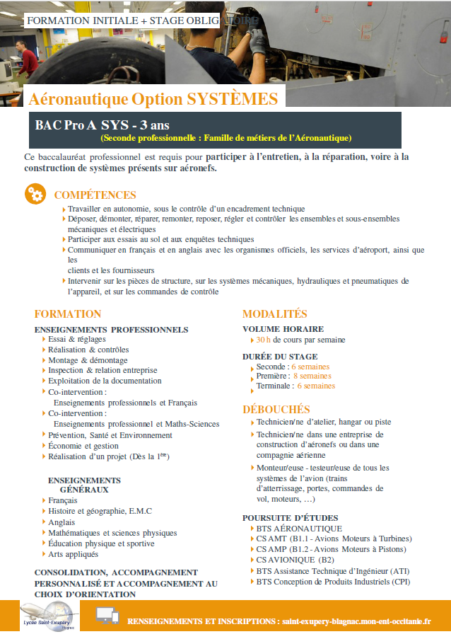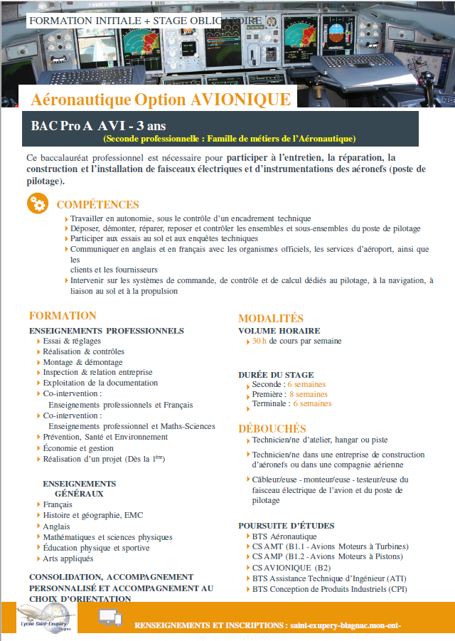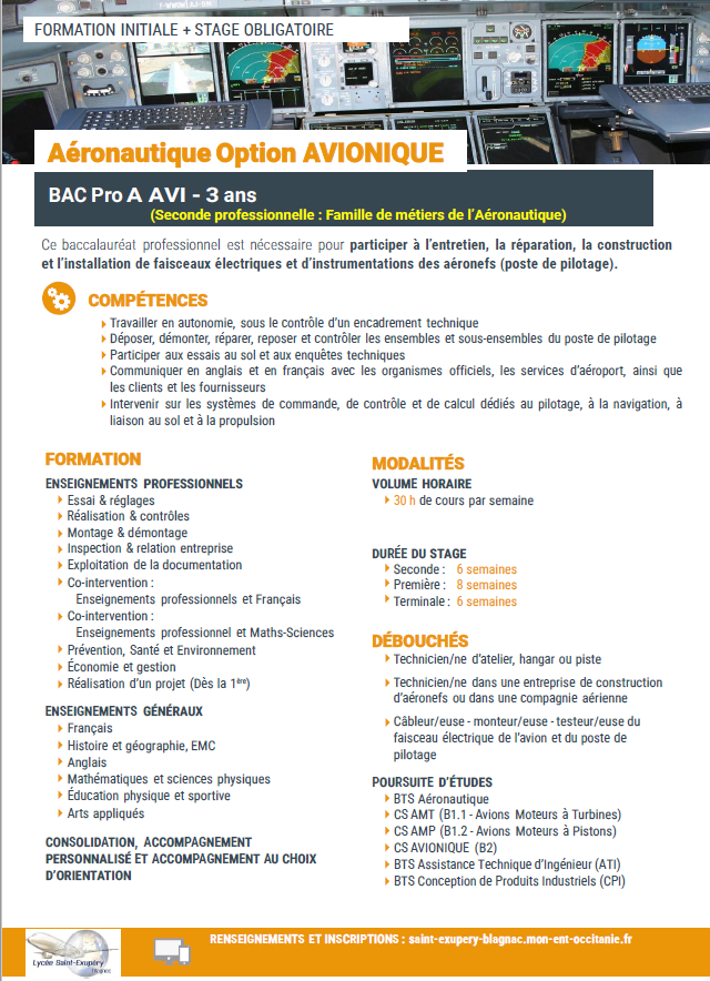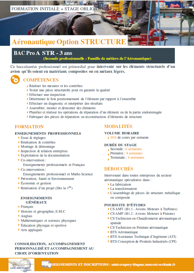La classe de seconde Aéronautique commune permet de choisir une option (Structure, Systèmes ou Avionique) pour la suite (première et terminale)